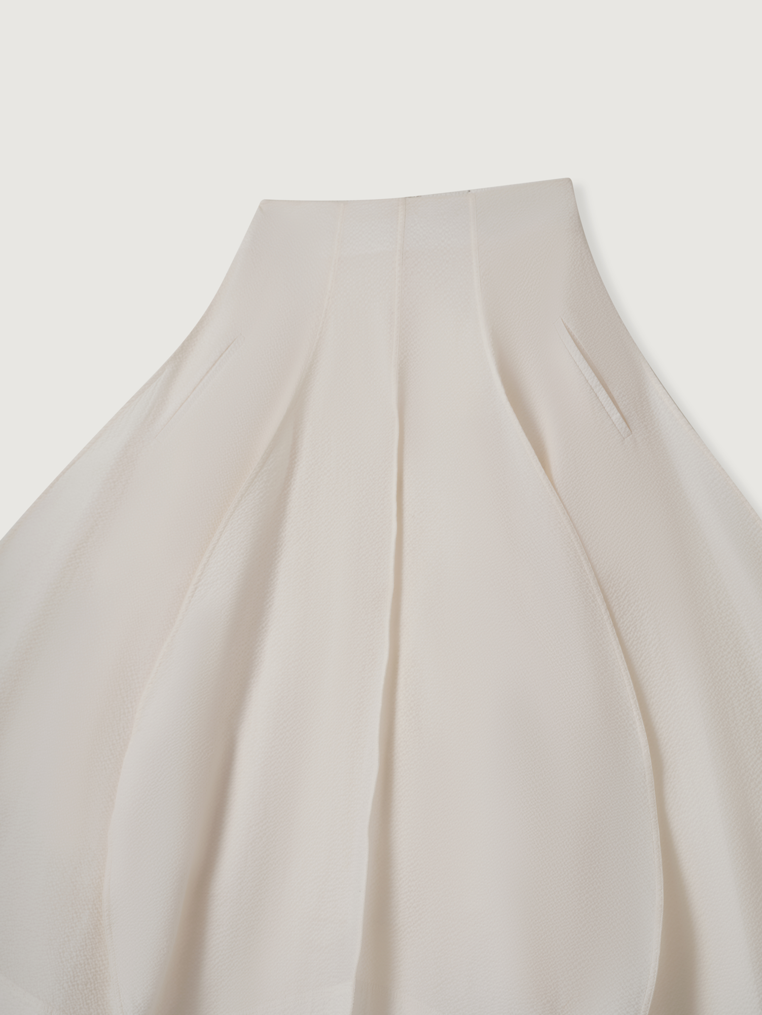 Mid-calf length skirt comes with an invisible zipper, created from multiple curved panels resembling a cocoon silhouette.